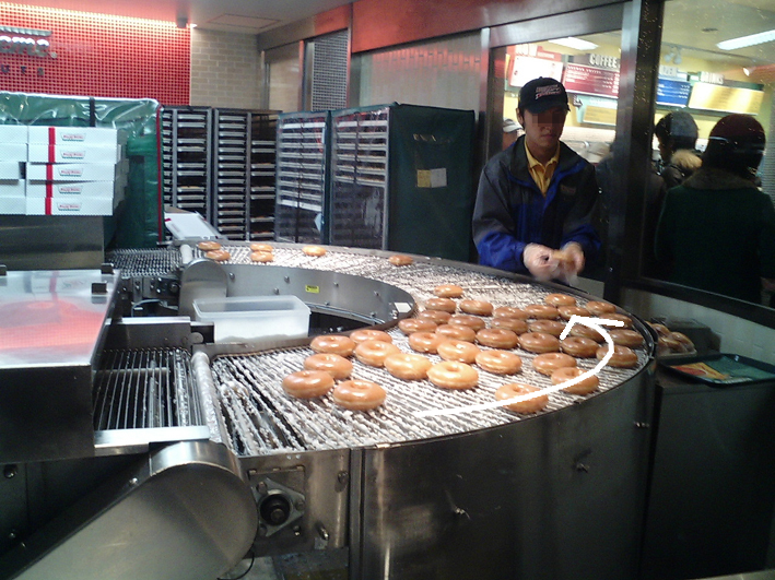 今日はダズン買いをせずふつうに並んだので、窓際でドーナツが出来上がる行程を写真に撮る事ができました。
